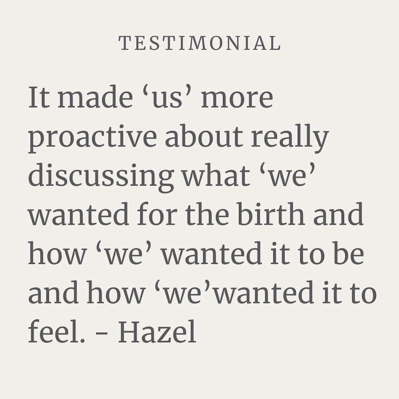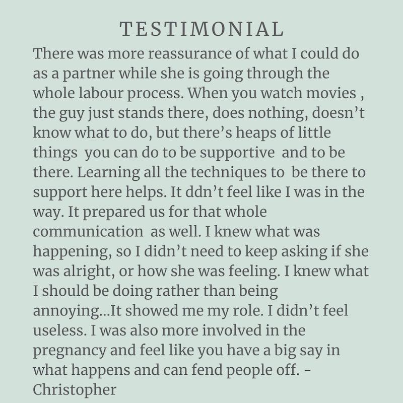 Increased partner engagement as Calmbirth equipped their partner with tools to navigate the birthing experience and decision making and helped them feel they had a place or role in childbirth. Calmbirth showed them lots of little things they could do to be supportive and be present. It prepared them to communicate. They knew what was happening so didn’t need to keep asking if they were okay. Defined their role, how to be more supportive so that they didn’t feel useless and were more involved with the pregnancy.