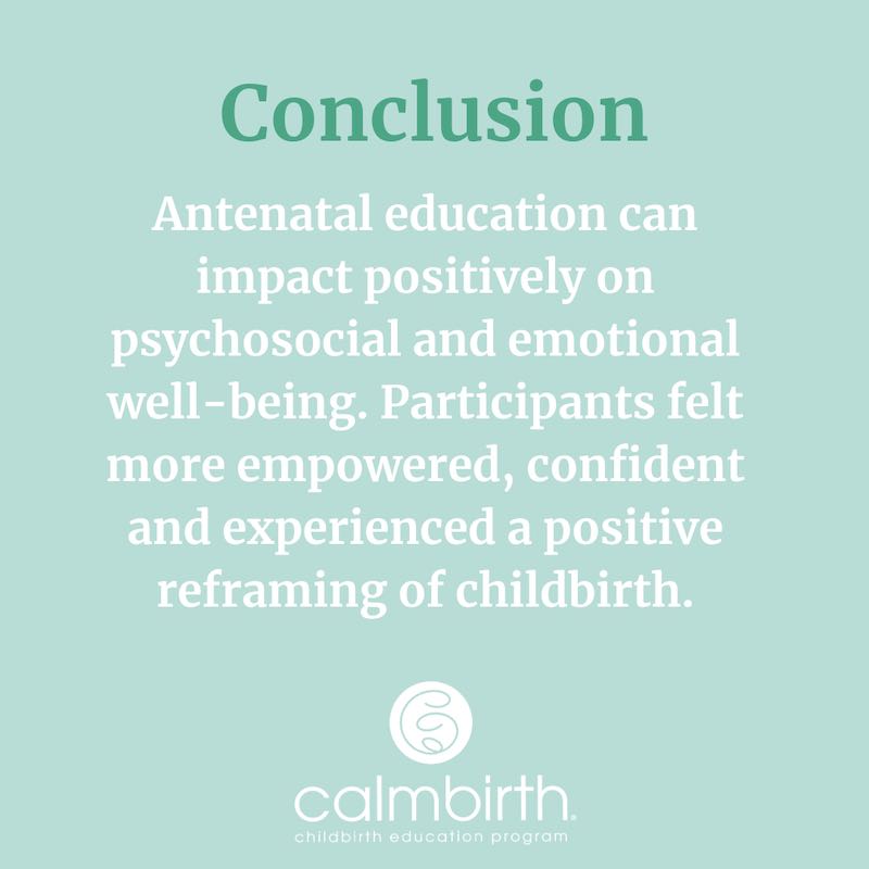 This Independent Qualitative Evaluative Study of Calmbirth classes conducted at the Auckland District Hospital in Auckland New Zealand found that the Calmbirth Antenatal education can impact positively on psychosocial and emotional well-being. Participants felt more empowered, confident, and experienced a positive reframing of childbirth. (Crowther et al. 2024)